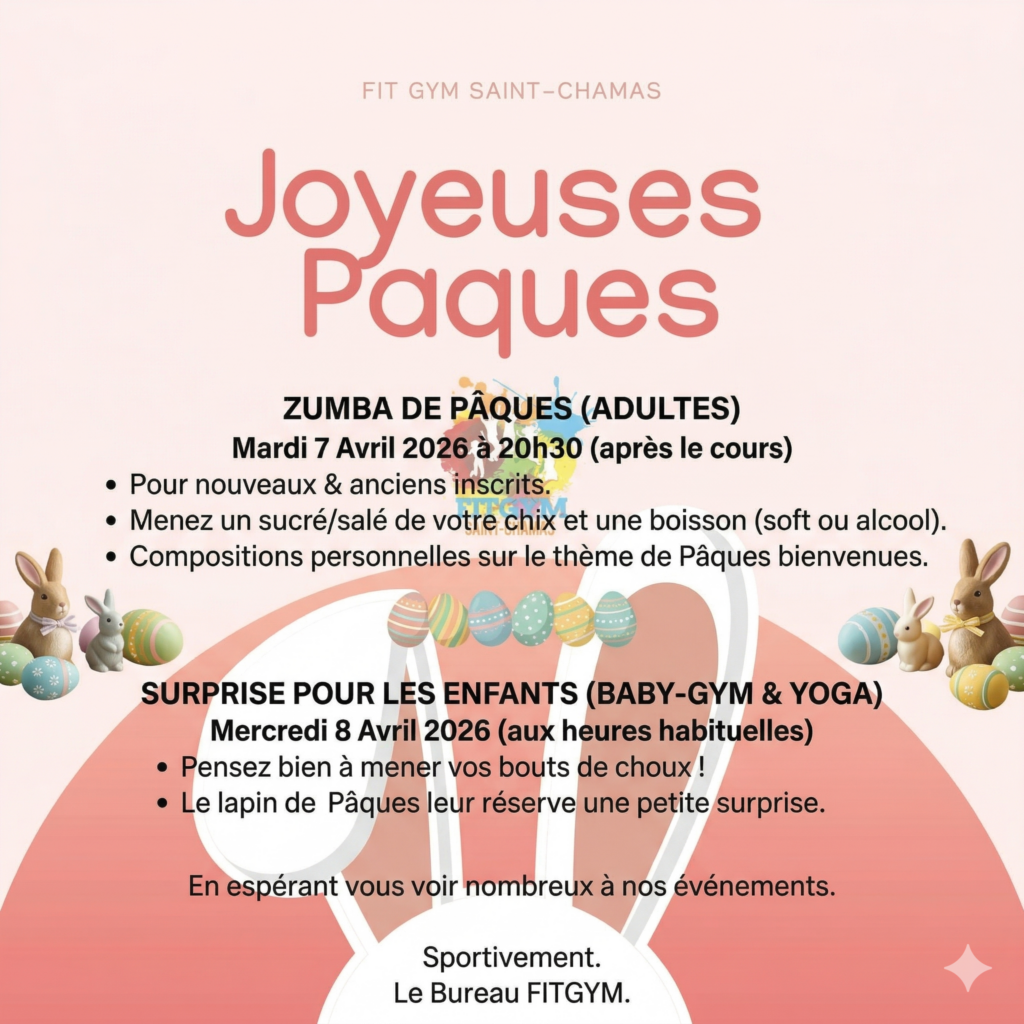Pour cette année également, suite aux créations des cours de Baby-Gym et Yoga Enfants, pensez bien à mener vos bouts de choux le mercredi 8 Avril 2026 aux cours habituels, je pense que le lapin de Pâques aura une petite surprise pour eux.